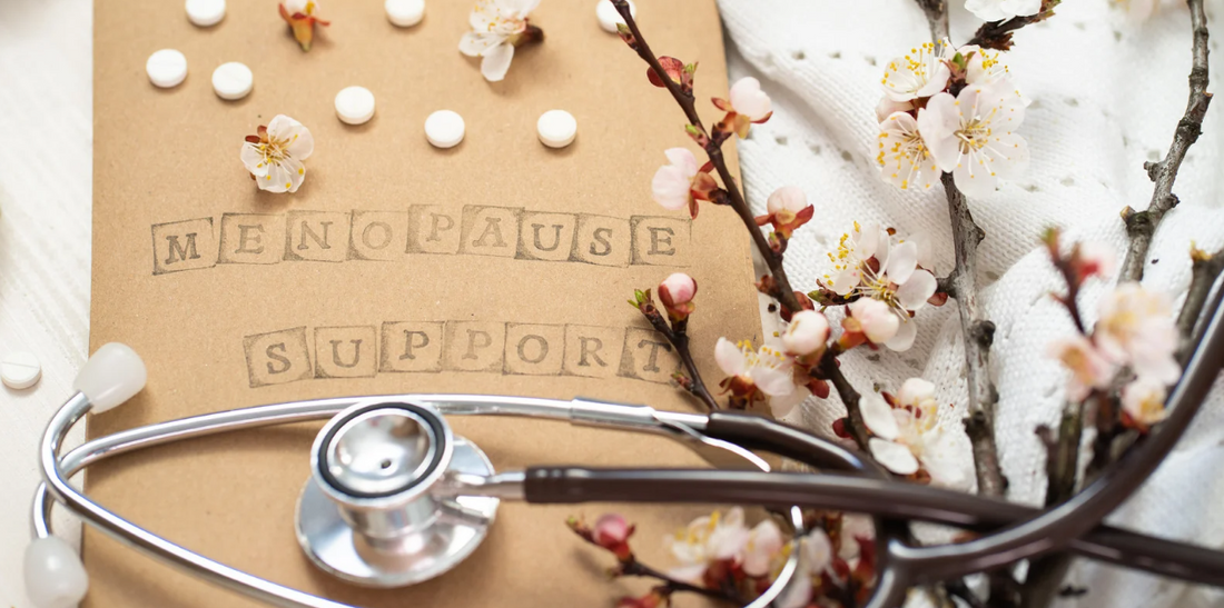The image shows a brown paper with "Menopause Support" stamped on it, surrounded by white pills, a stethoscope, and delicate cherry blossoms on a soft, knitted fabric background.