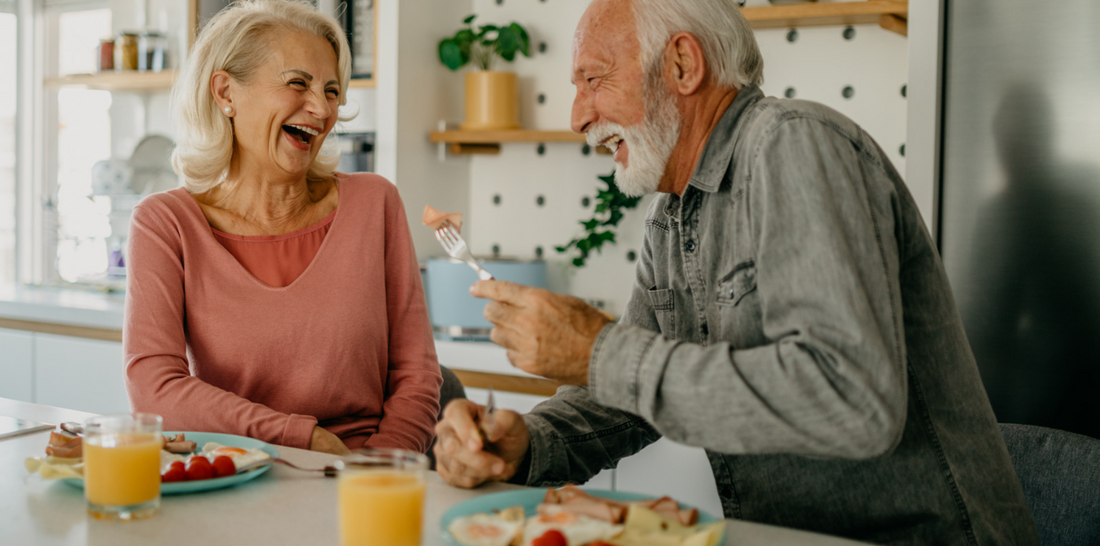 Elderly couple laughing over breakfast.