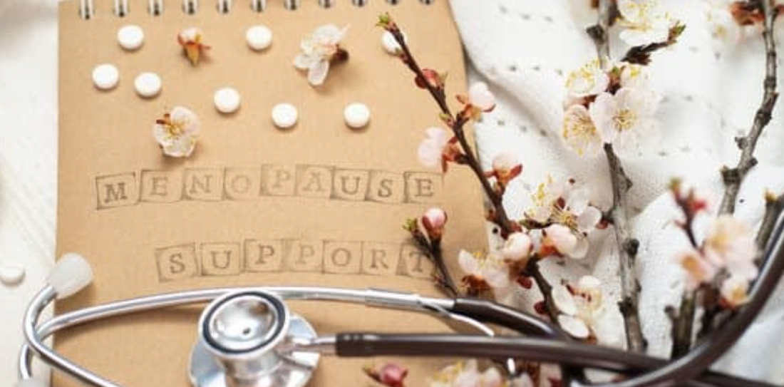 Close-up of a spiral-bound notebook with the words "MENOPAUSE SUPPORT" written in a stamped, block-letter style.